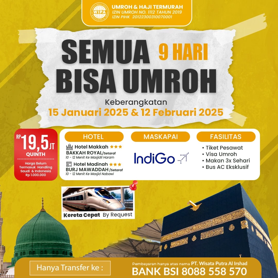 Baca juga: Biaya Harga Paket Umroh Murah Tapi Mewah Manggar, Belitung 2024 2025 2026 Melakukan Ibadah dengan Penuh Makna Umroh bersama Travel Wipa Dengan kantor pusat yang terletak di Jl. I Gusti Ngurah Rai No. 1, Jakarta Timur, DKI Jakarta, Travel Wipa menawarkan pengalaman unik dalam perjalanan ibadah umroh, yang tidak hanya nyaman tetapi juga |