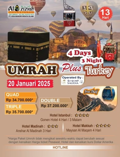 Umroh Plus Turki: Program 13 Hari Berangkat 20 Januari TH. 2025, Travel umrah semakin menarik dengan penawaran paket Umrah Plus Turkey dari Al Aziziah, yang akan memberikan pengalaman spiritual dan wisata dalam satu perjalanan yang tak terlupakan. Dalam paket ini, jamaah tidak hanya melaksanakan ibadah umrah di Tanah Suci, tetapi juga menikmati wisata religi dan budaya di Turki.