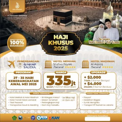 Bina Harmain mempersembahkan paket Haji Khusus dengan keberangkatan dijamin 100%. Penerbangan akan menggunakan maskapai Saudia, dan perjalanan ini mencakup penginapan di hotel berbintang lima baik di Mekkah (Shafwa Royale) maupun di Madinah (Al-Aqeeq), dengan program perjalanan selama 27-35 hari pada awal Mei 2025.