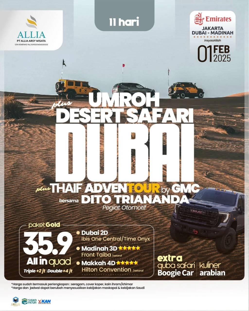Mari tumpahkan kerinduan Anda di Tanah Suci dengan pengalaman ibadah yang sempurna serta nikmati wisata Desert Safari di DUBAI bersama Pegiat Otomotif DITO TRIANANDA !