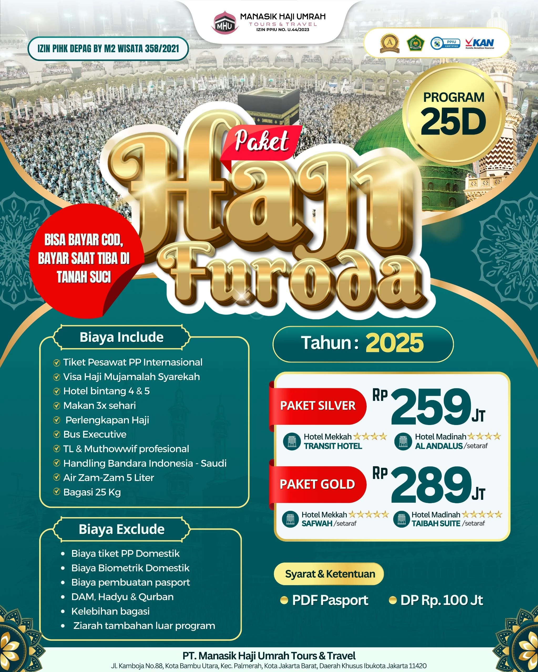 Untuk mendaftar, jamaah diharuskan mengirimkan PDF paspor dan melakukan pembayaran DP sebesar 100 juta. Pelunasan dapat dilakukan dengan cara bayar COD saat tiba di Tanah Suci, dengan syarat DP sudah dibayarkan kepada travel. Dengan semua fasilitas dan layanan yang ditawarkan, Paket Haji Furoda 2025 menjadi pilihan tepat bagi siapa saja yang ingin melaksanakan ibadah haji dengan nyaman dan berkualitas.