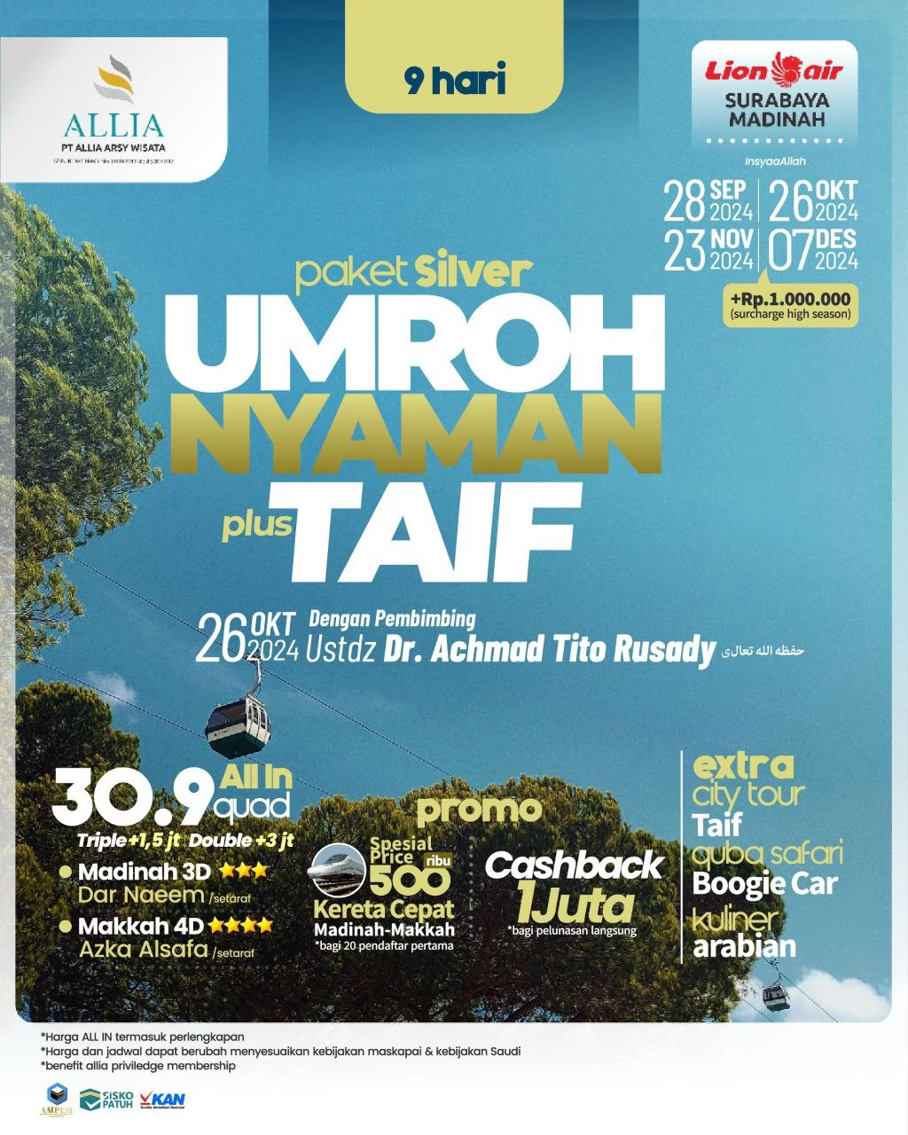 Umroh sesuai Sunnah bareng Allia Tour menjadi pilihan ideal bagi Anda yang ingin menunaikan ibadah umroh tanpa harus meninggalkan keseharian di tengah kesibukan kota. Dengan harga yang terjangkau, paket ini memberikan pengalaman spiritual yang tak terlupakan selama 9 hari dengan fasilitas lengkap, hotel dekat serta Spesial Extra Tour Thaif