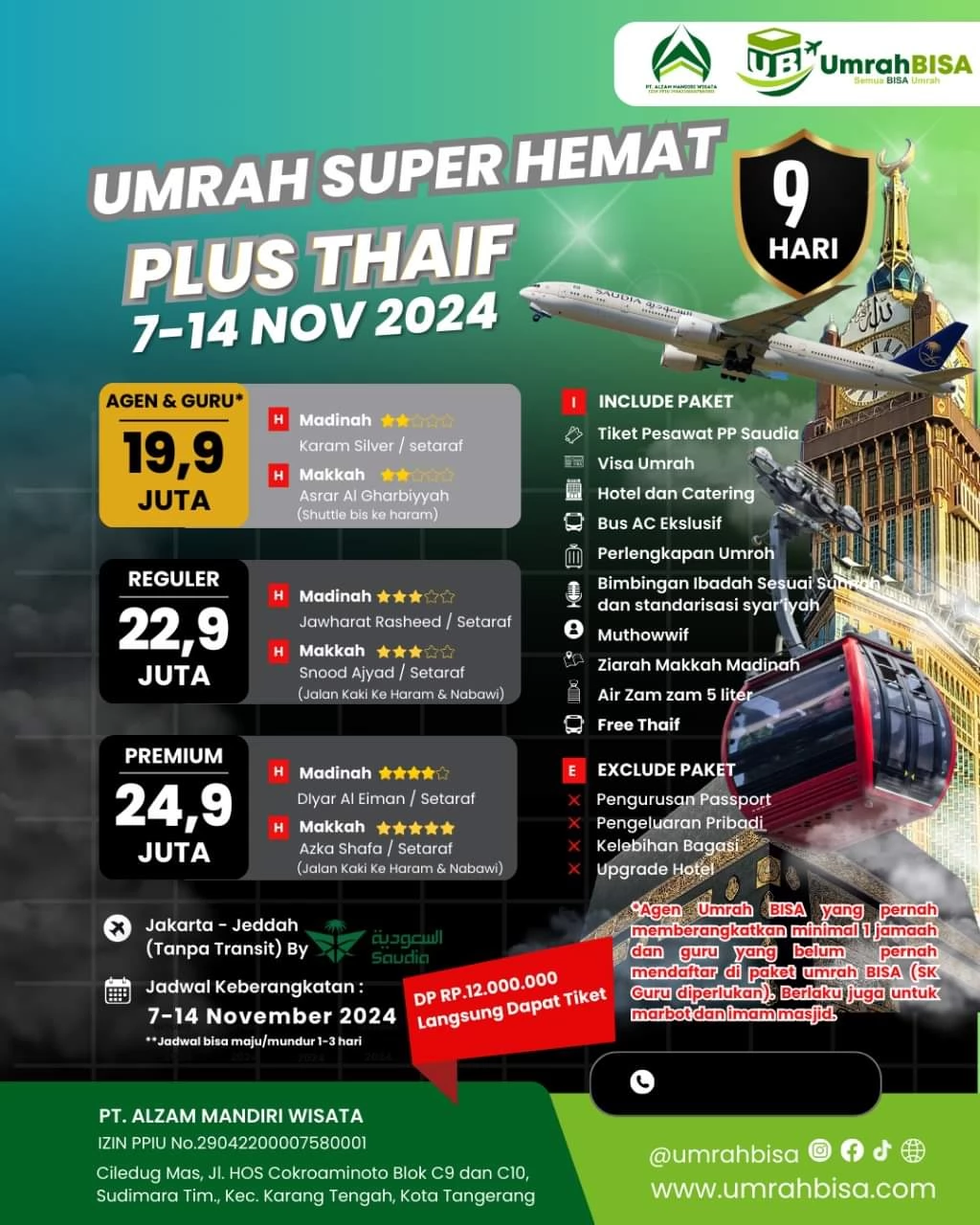 Bagi umat Muslim, menjalankan ibadah umrah adalah momen yang sangat istimewa dan penuh makna. Menyambut tahun 2024, Umrah BISA menawarkan paket "Umrah Super Hemat Plus Thaf" yang berlangsung dari 7 hingga 14 November 2024. Berikut adalah rincian menarik tentang paket ini.