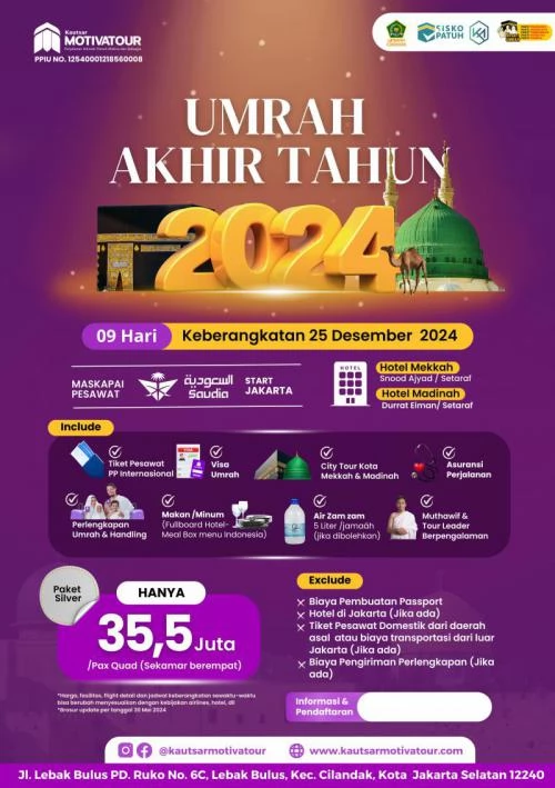Dengan paket yang lengkap ini, Anda tidak hanya menjalani ibadah dengan khusyuk, tetapi juga bisa merasakan wisata religi yang tak terlupakan. Pastikan Anda menjadi bagian dari rombongan Umroh Akhir Tahun bersama Motivatour dan wujudkan impian Anda untuk mengunjungi tanah suci.