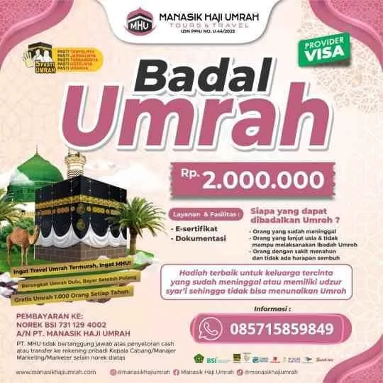 Dengan menggunakan layanan Badal Umrah dari agen Manasik Haji Umrah, Anda mendapatkan kemudahan dalam pelaksanaan ibadah. E-Sertifikat dan dokumentasi akan diperoleh dengan biaya terjangkau sekitar Rp 2.000.000.