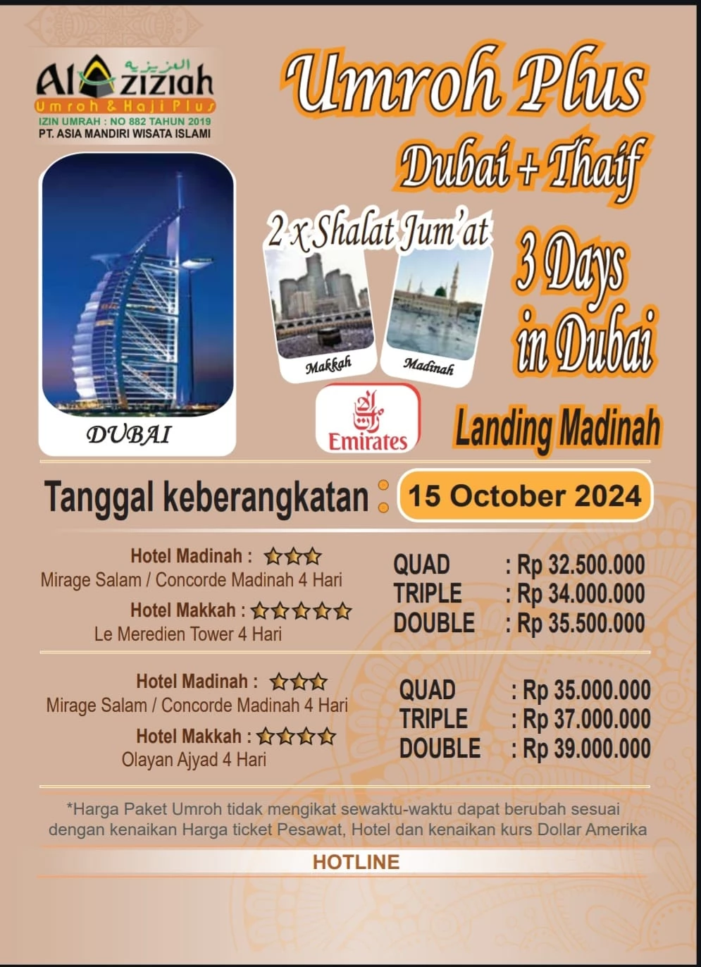 Segera daftarkan diri Anda untuk pengalaman umroh yang tak terlupakan dengan tambahan wisata menarik di Dubai dan Thaif pada tanggal 15 Oktober 2024.