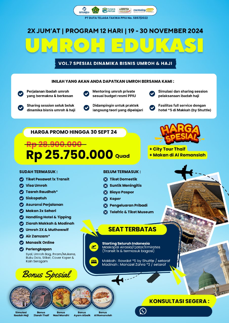 Program umroh edukasi mengajarkan peserta cara mencari vendor transportasi, akomodasi, dan layanan pendukung lainnya untuk perjalanan ibadah.