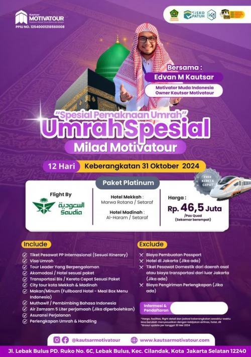 Jangan lewatkan kesempatan berharga untuk melaksanakan umroh dalam suasana yang khusyuk dan nyaman. Daftarkan diri Anda segera dan rasakan pengalaman umroh spesial Milad Motivatour 2024 bersama kami.