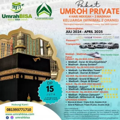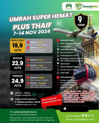 Program Umroh Edukasi 2024 ini menawarkan kombinasi sempurna antara ibadah, edukasi, dan wisata. Dengan durasi 12 hari yang mencakup dua kali sholat Jum’at, Anda akan mendapatkan pengalaman spiritual yang mendalam dan tak terlupakan. Ditambah dengan fasilitas bintang lima dan perjalanan wisata ke Taif, program ini adalah pilihan terbaik bagi Anda yang ingin menjalani ibadah umroh dengan lebih khusyuk dan bermakna.