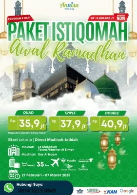 Kami dengan bangga mempersembahkan Program Umroh Edukasi 2024 yang dirancang khusus untuk Anda yang menginginkan pengalaman ibadah sekaligus memperdalam pengetahuan agama dengan suasana yang nyaman dan eksklusif. Dengan program 12 hari yang mencakup dua kali sholat Jum’at di Masjidil Haram, paket ini memberikan waktu yang lebih leluasa untuk beribadah serta menikmati keindahan dan kekayaan sejarah kota suci.