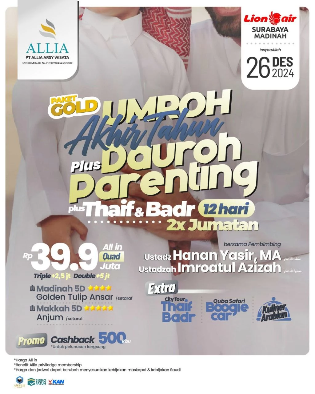 Paket Gold Spesial Akhir Tahun Plus “DAUROH PARENTING”, paket ini memberikan pengalaman spiritual yang tak terlupakan selama 12 hari dengan fasilitas lengkap, hotel dekat serta Spesial Extra City Tour ke Thaif dan Badar tanpa tambahan biaya. Thaif & Badar adalah kota-kota bersejarah yang memiliki banyak nilai spiritual dan sejarah Islam yang bisa Anda pelajari.
