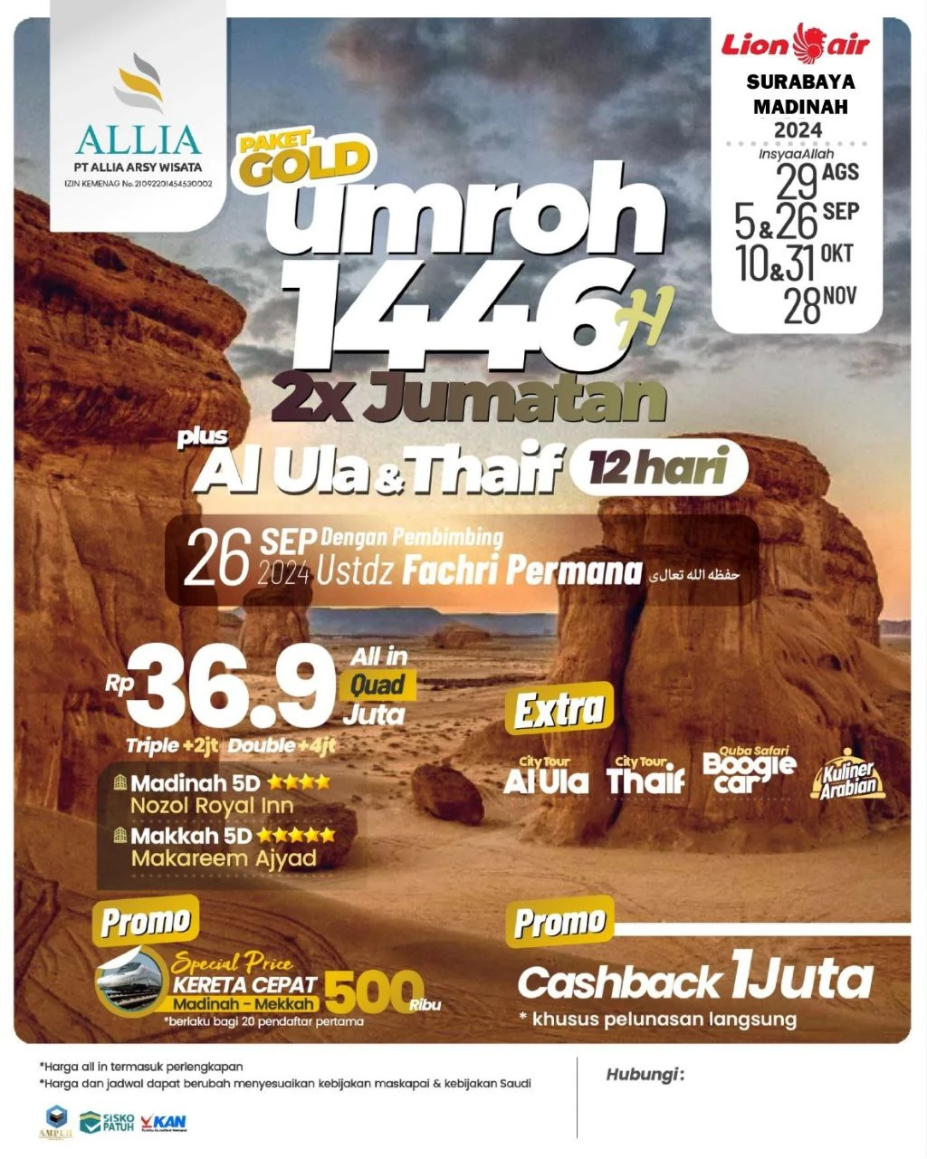 Umroh sesuai Sunnah bareng Allia Tour menjadi pilihan ideal bagi Anda yang ingin menunaikan ibadah umroh dengan bimbingan sesuai Sunnah yang makin mudah dan maksimal dalam Ibadah agar mampu meraih banyak Fadhilah/Keutamaan selama beribadah di Tanah Suci. Dengan memilih paket ini sahabat akan mendapatkan pengalaman spiritual yang tak terlupakan selama 12 hari dengan fasilitas lengkap, hotel dekat serta Spesial Extra Tour Al Ula.