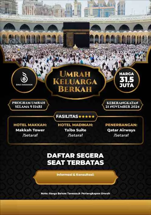 Jangan lewatkan kesempatan untuk melakukan ibadah umrah bersama keluarga dalam program *Umrah Keluarga Berkah*. Jadikan momen spiritual ini sebagai pengalaman yang akan dikenang seumur hidup. Daftar segera dan raih keberkahan di tanah suci!
