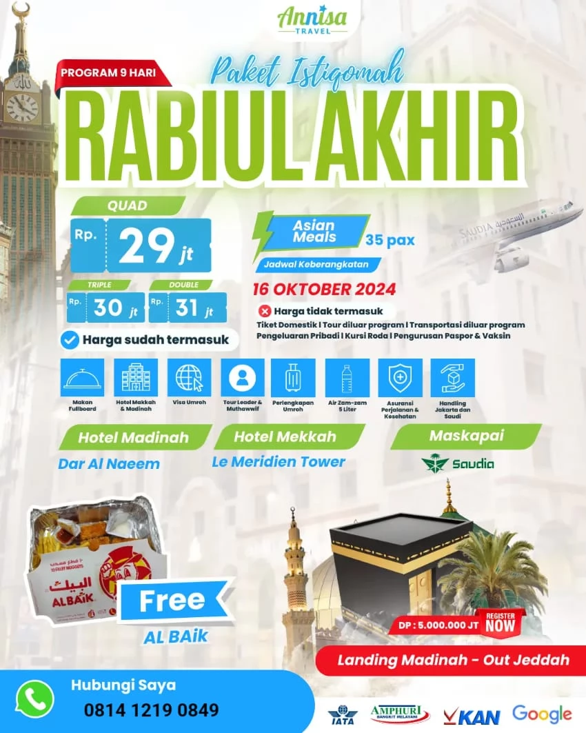Bersiaplah untuk merasakan ketenangan spiritual dan kedamaian hati melalui Paket Istiqomah Rabiulakhir dari Annisa Travel. Dirancang dengan cermat untuk memberikan kenyamanan maksimal bagi jamaah, paket Umrah ini menawarkan perjalanan selama 9 hari yang penuh dengan keberkahan. Dengan jadwal keberangkatan pada 16 Oktober 2024, paket ini cocok untuk Anda yang ingin menjalankan ibadah Umrah dengan tenang dan khusyuk.