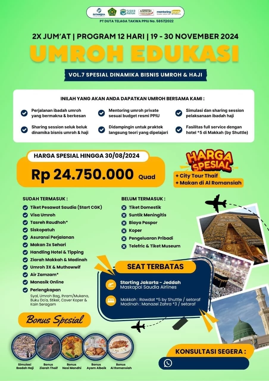 Dengan seat terbatas, segera daftarkan diri Anda dan mulailah perjalanan spiritual serta edukasi bisnis umroh Anda bersama Umroh Edukasi Vol.7. Untuk informasi lebih lanjut dan konsultasi, hubungi kami segera!